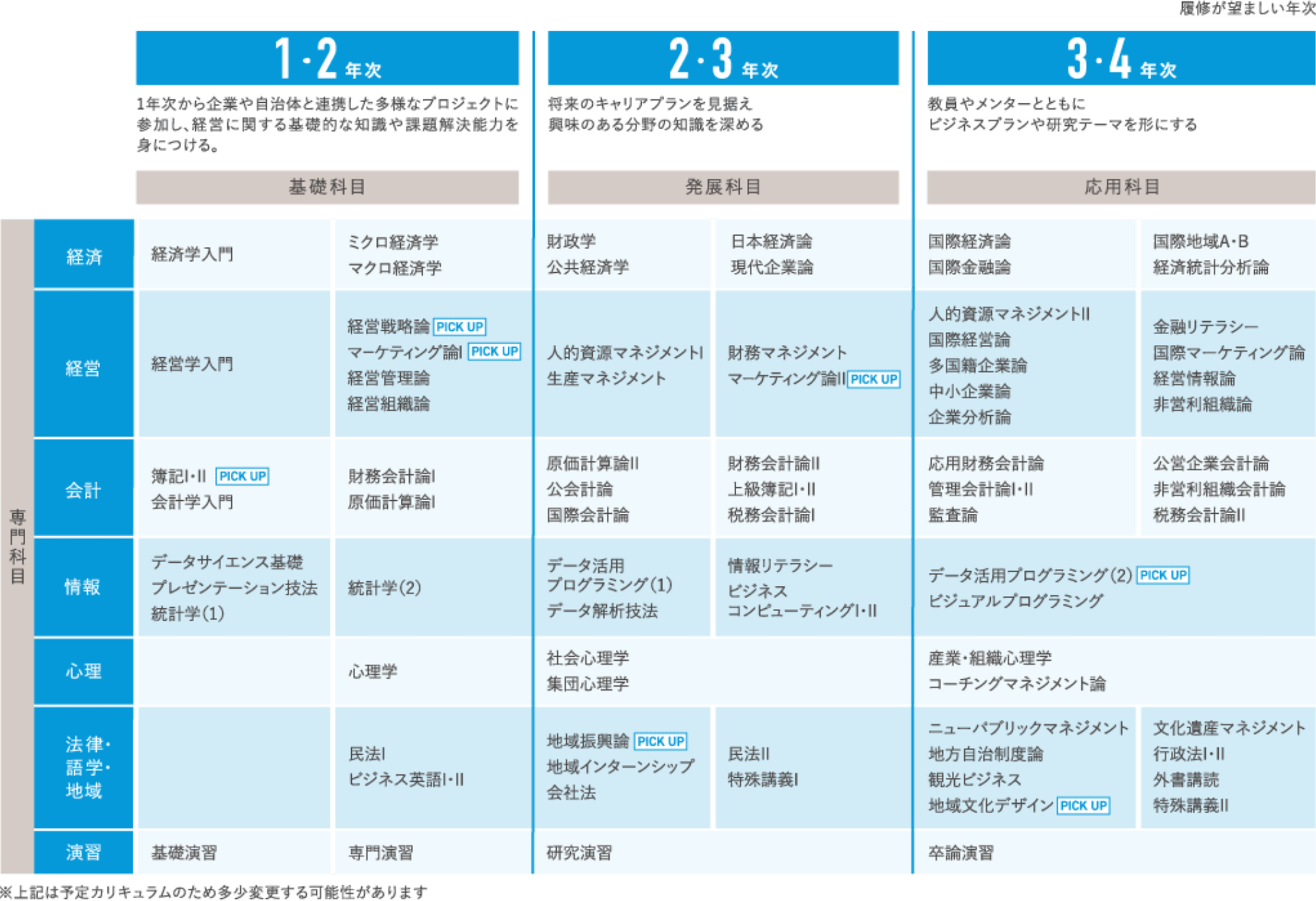 経営学とは、企業や組織がどのようにしたらうまくいくのかを学ぶ学問です。ビジネス学科では、マーケティングやマネジメント、会計、法律、データなどさまざまな角度から企業や組織について学び、実践的なPBL(課題解決型学習)を行うことで、ビジネススキルを身につけていきます。将来につながる多彩なフィールドを用意し、教員や地域のメンターが学生一人ひとりの興味ややる気をサポートします。