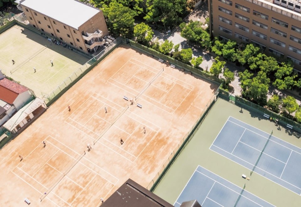 テニスコートは6面を完備します。本学テニス部のほかにも本学園中学校・高等学校テニス部の練習を行っています。