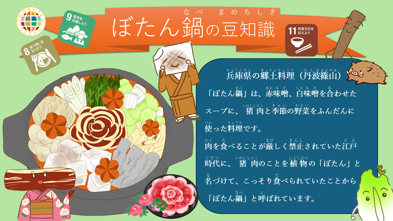 丹波篠山「ぼたん鍋」を題材としたデジタル紙芝居は、令和6年度SDGs HYOGO 青年チャレンジ事業プロジェクトの一環で、地域の子どもたちに食育の観点から郷土料理の伝承、食品ロスの削減、地産地消の大切さを伝えるために作成しました。