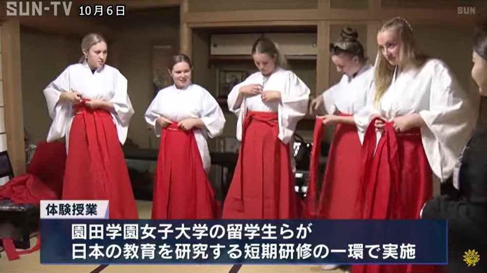 本学の留学生が日本文化への理解を深めるたことを目的とした、尼崎えびす神社での体験プログラムがサンテレビの取材を受けました。このプログラムは、小学校教員をめざすカンタベリー大学生が尼崎市立小学校等を訪問し、教育の比較研究をする短期研修の一環として行われています。同神社では神道や日本文化についての理解を深めた後、巫女装束を着付けし、日本ならではの文化にふれていました。コロナ禍を経て4年ぶりに開催されたプログラムには、今年5月から本学で学んでいるウクライナ避難学生も加わり、通訳等のサポートを行いました。一行はこの後、但馬地域でのホームステイを行う予定です。