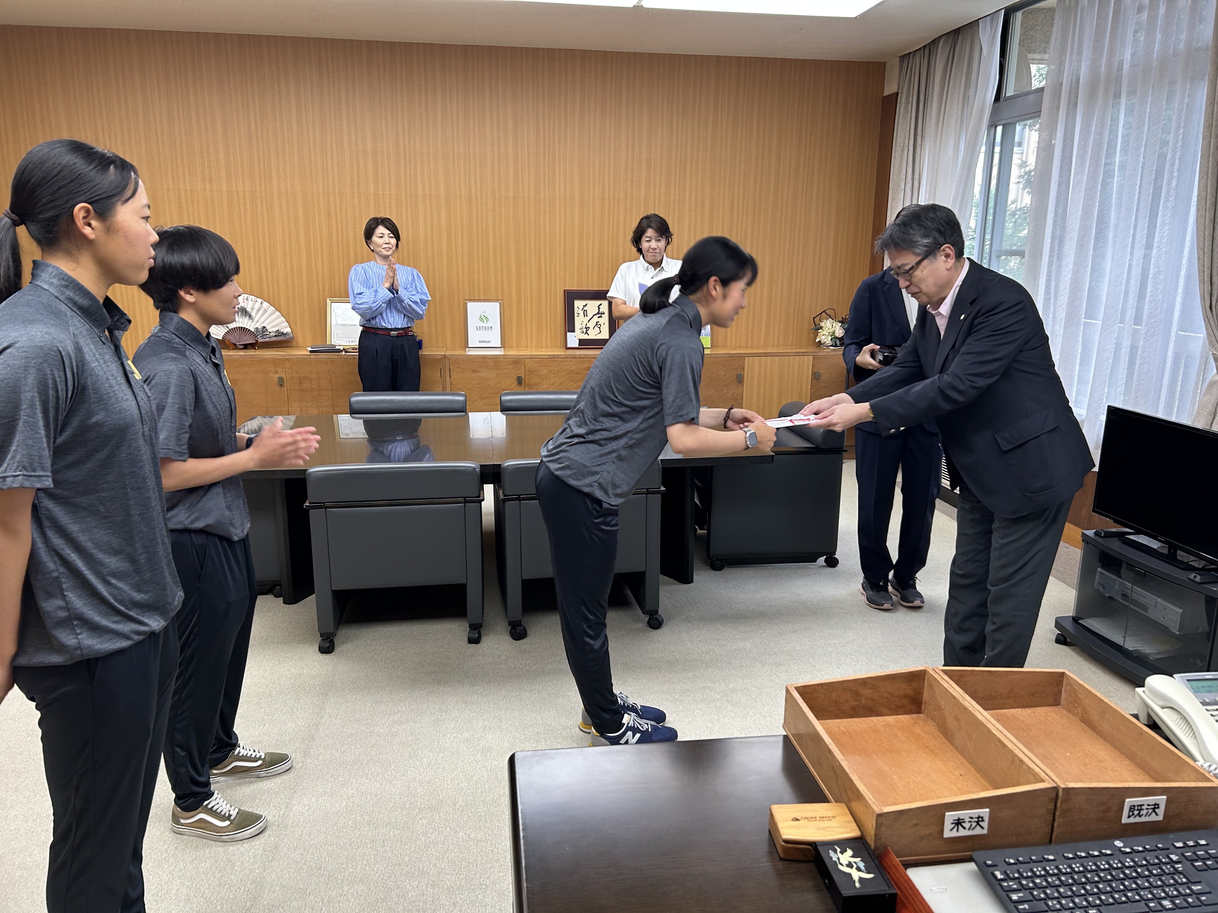 大江学長から選出された3名の活躍を祈念し、激励金をお渡しいただきました。