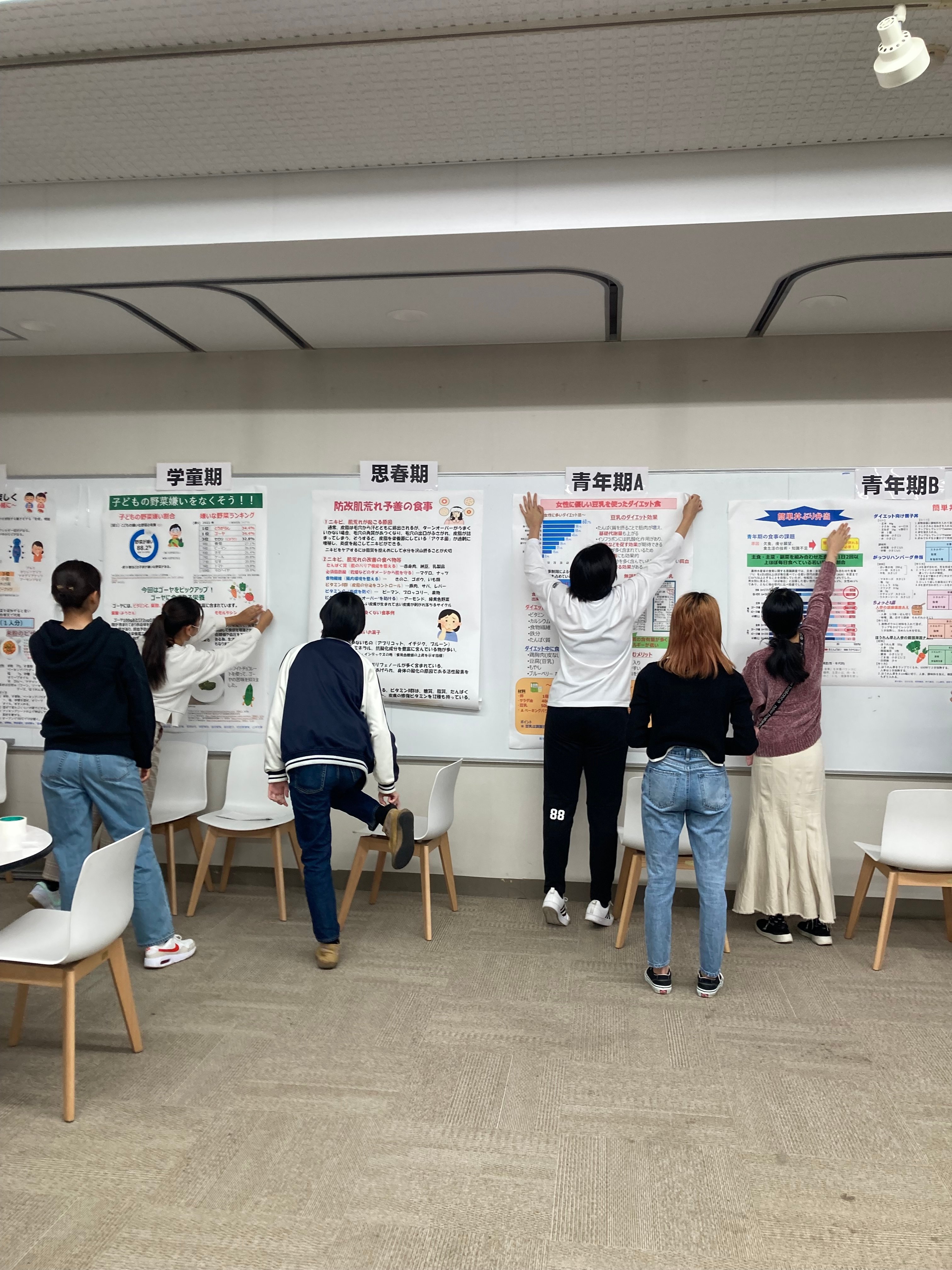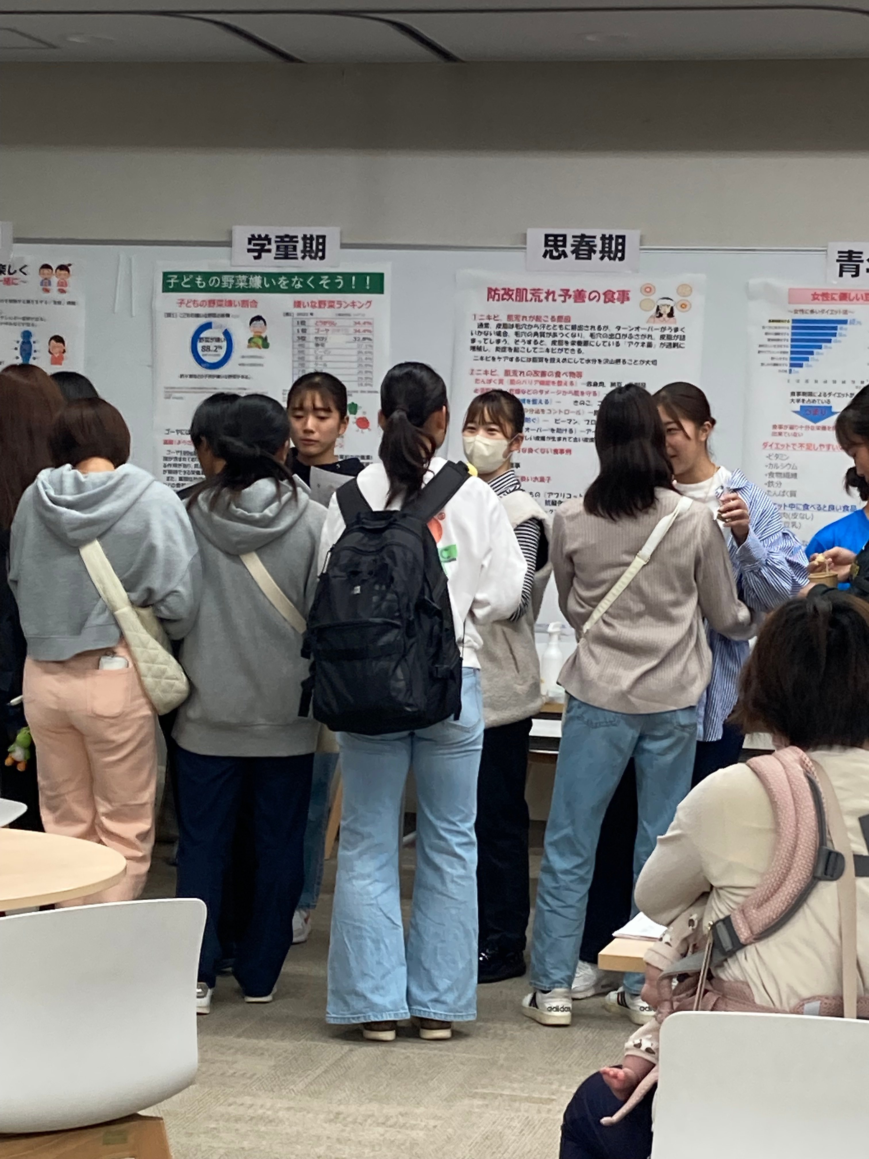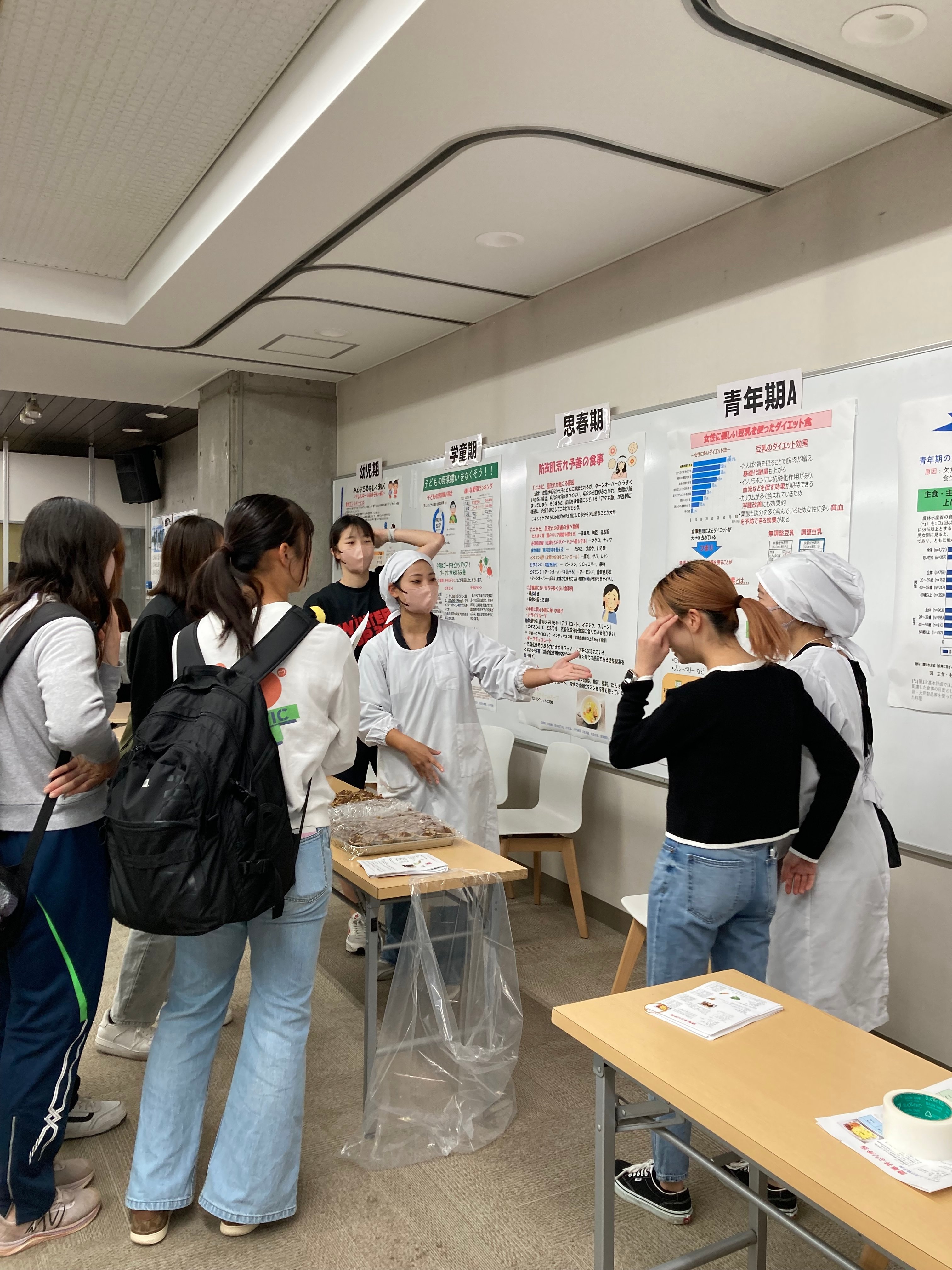 けやき祭にて、1年次生が地域栄養学Ⅰの授業で健康フェアを開催しました。4月からの学びを形に、1年次生がライフステージ別の健康課題をポスターで掲示し、3年ぶりに課題解決のためのメニューを試食として提供いたしました。たくさんの方に来場いただき、とても美味しいとお声をかけていただきました。ご来場いただきました皆さま、ありがとうございました。