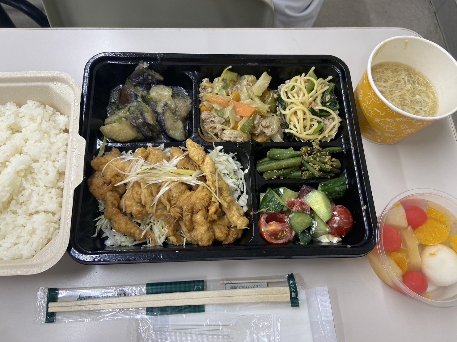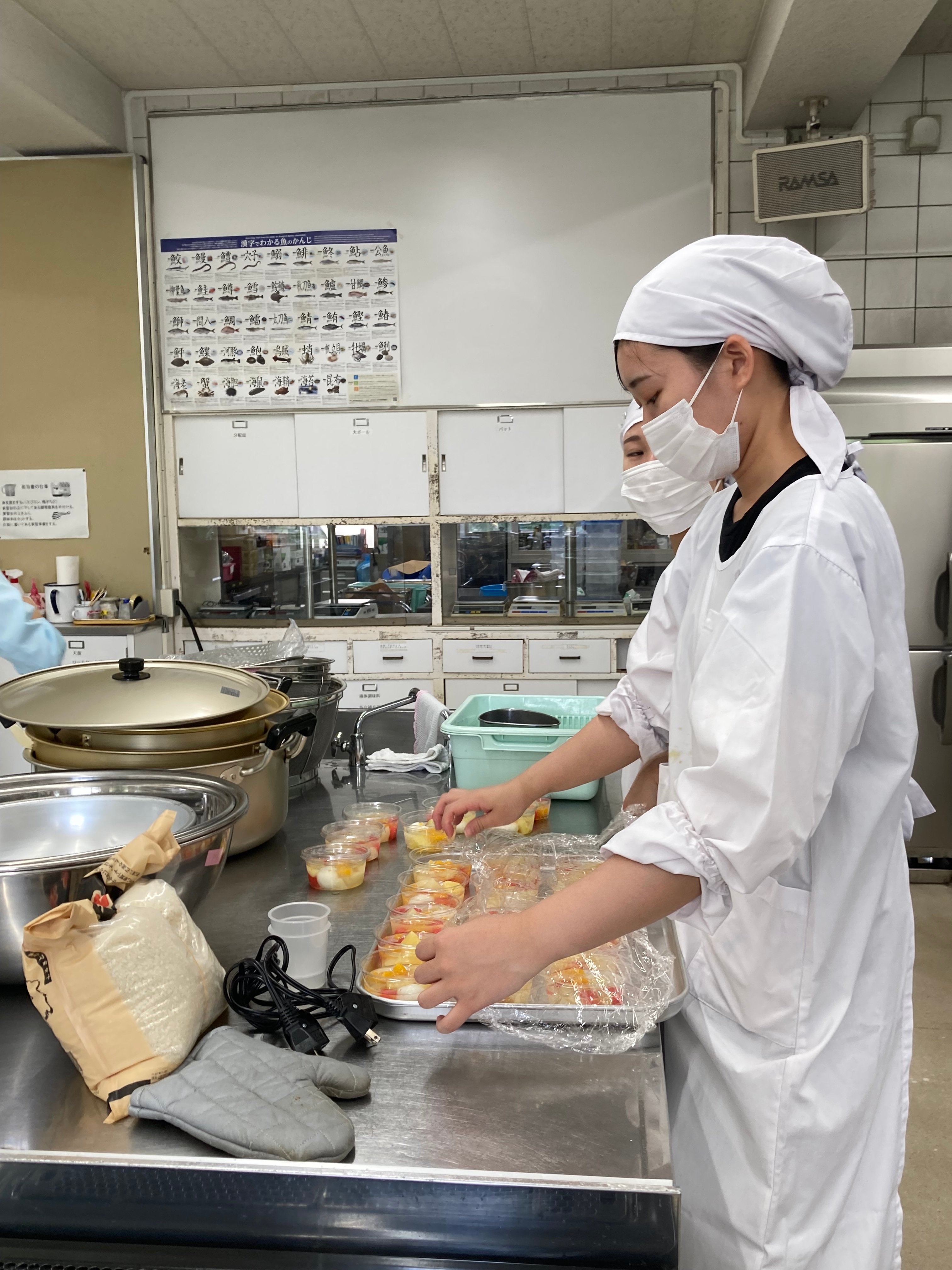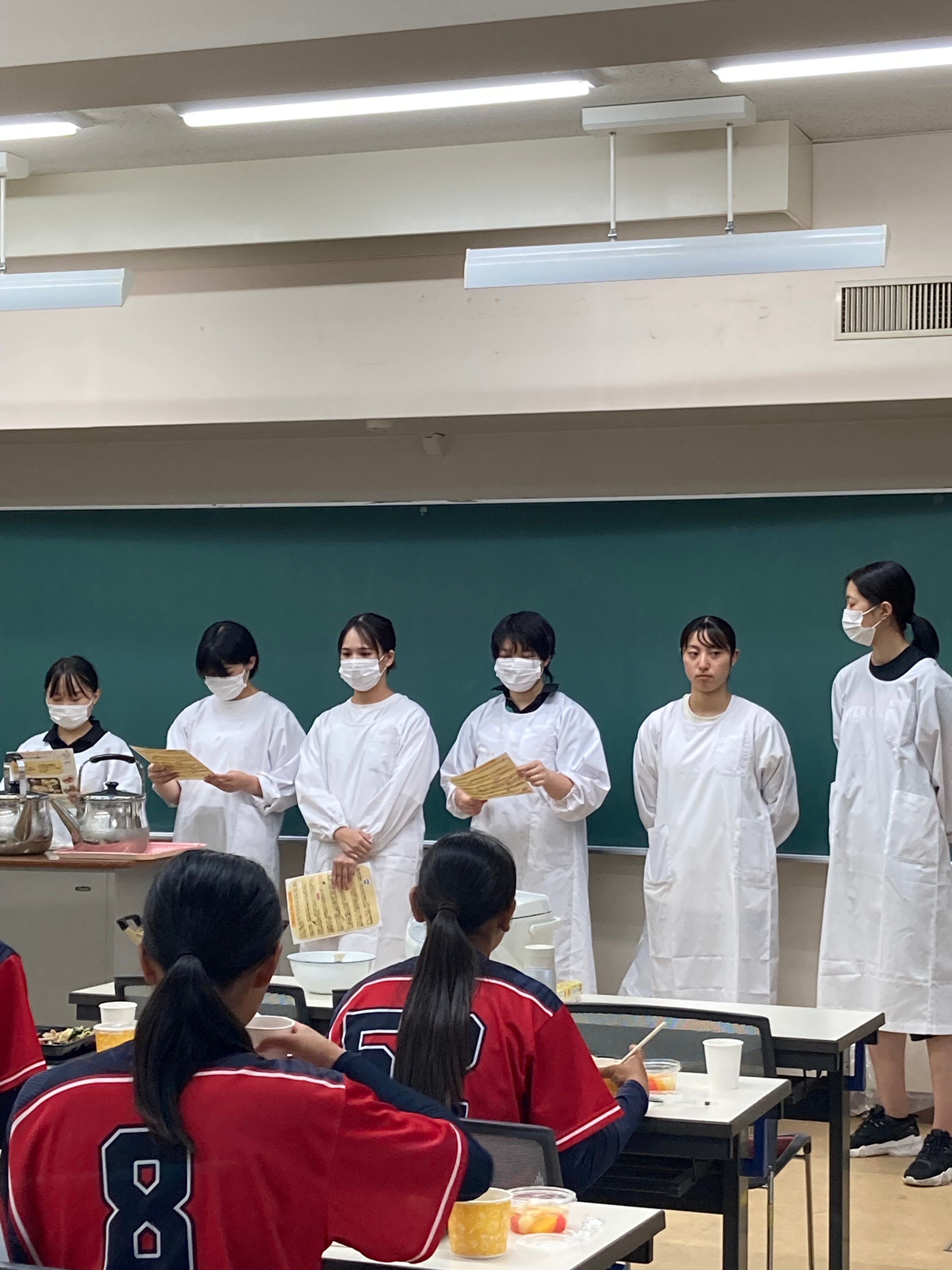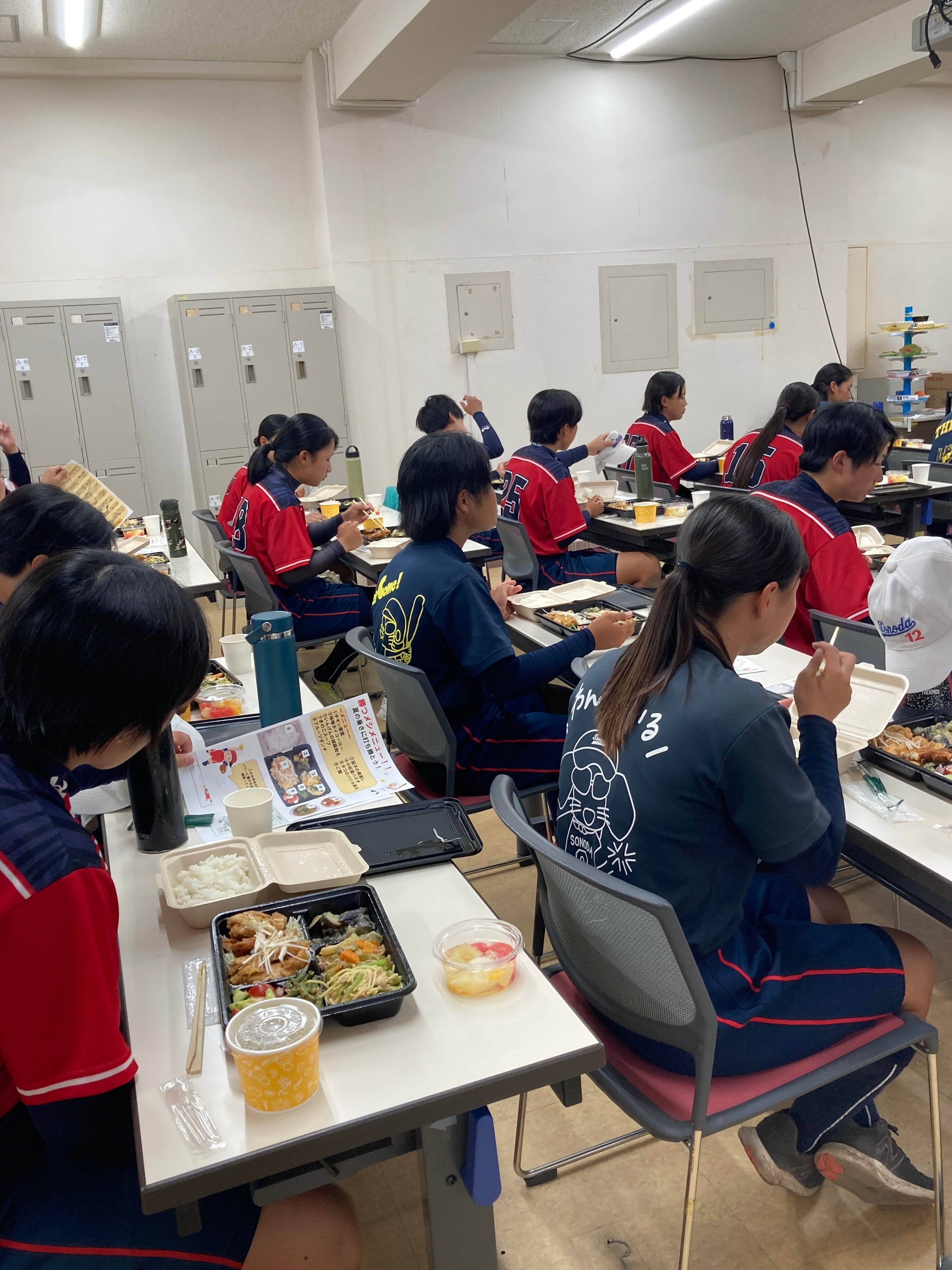 今年のテーマは、「夏バテ予防のスタミナアップ」です。実践的なスポーツ栄養の実習として、60食のお弁当づくりを行いました。ソフトボール部の学生さんにエネルギーは1食1,600kcalで提供し、たくさんおかわりいただきました。栄養的意味を説明し、選手権大会にむけて力をつけてもらえると嬉しいです。
