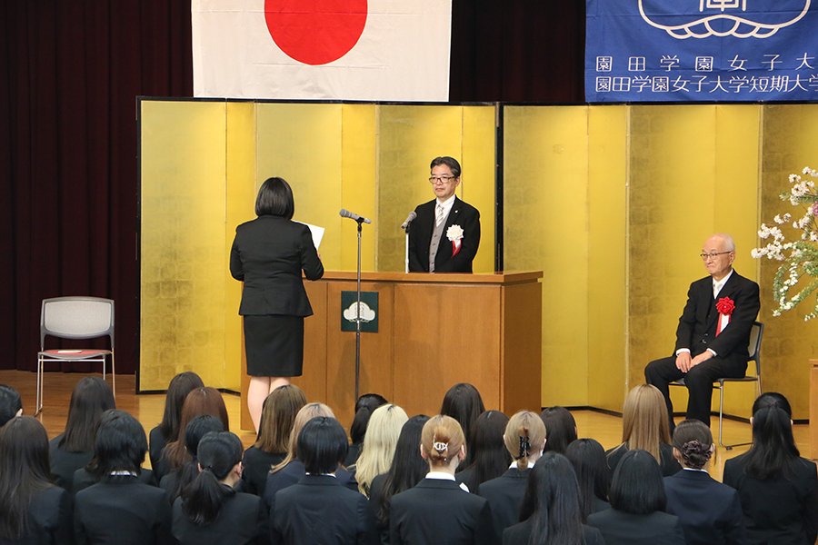 本日より、皆さんが園田学園女子大学ならびに園田学園女子大学短期大学部の学生として心身ともに健やかで明るく楽しい、そして実り多い学生生活を送られることを心から希望し、入学宣誓式に当たってのお祝いの言葉といたします。