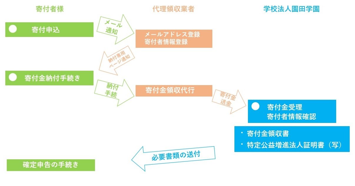 後日、減免税措置にお使いいただける本学発行の「寄付金領収書」、「特定公益増進法人であることの証明書(写)」を発行し、送付いたします。